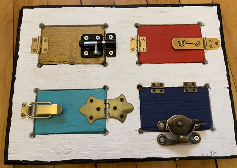 - A latchboard for my younger child's first birthday. Here's a photo: