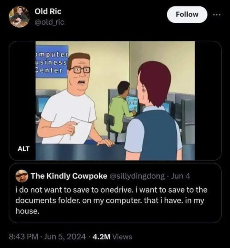 One thing that anyone who has set up a Windows PC recently has probably experienced is that you are nudged pretty forcefully into using OneDrive. This meme reflects my feelings on this.