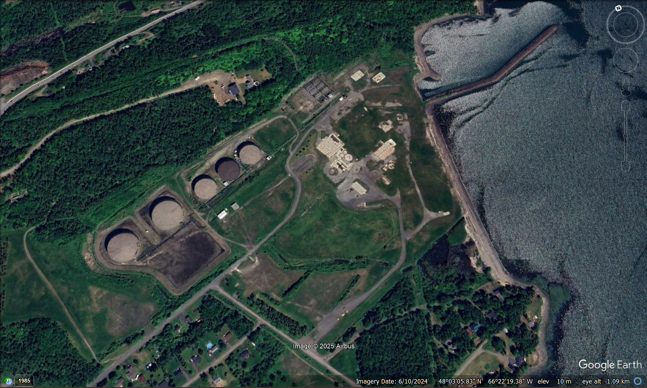 There was also a 315 MW generating station in Dalhousie. It burned Orimulsion, which was sourced from Venezuela. (Important parenthetical: despite Canada being a net exporter of oil and gas, power plants and refineries on the east coast import it from abroad due to limitations in infrastructure for moving this resource within the country). The political situation there led to them ceasing to sell this fuel to Canada in 2006 (and no new supply contracts after 2004). Decommissioning of the plant started in 2013. Some elements—just the tank farm as far as I can tell—are still a work in progress, but the dramatic moment came in 2015 when the power plant and its smoke stacks were demolished. The first attempt at demolishing the power plant did not bring down the stacks, as caught on video here: