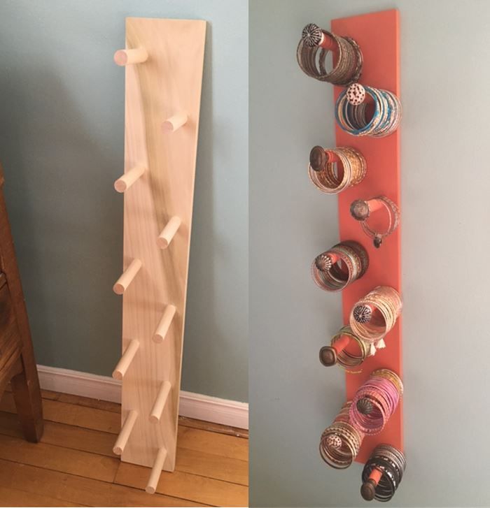 My wife has a collection of bangles and was looking for an efficient way to store and display them. I made a board with pegs to hang them on. Here it is after the main construction (which was straightforward) was complete and after some finishing touches (where some creativity was involved):