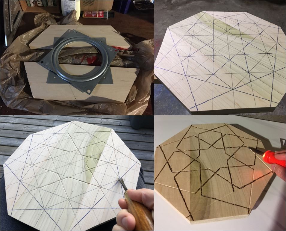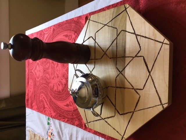I decorated the top surface using a tiling motif whose pattern was in a book by Eric Broug. He provided instructions for drawing a bunch of construction lines (in pencil) then inking over the ones that are to be kept as part of the pattern. I then used a carving tool to gouge out the lines and a soldering iron to burn them into the wood for enhanced contrast. Here is the finished product:
