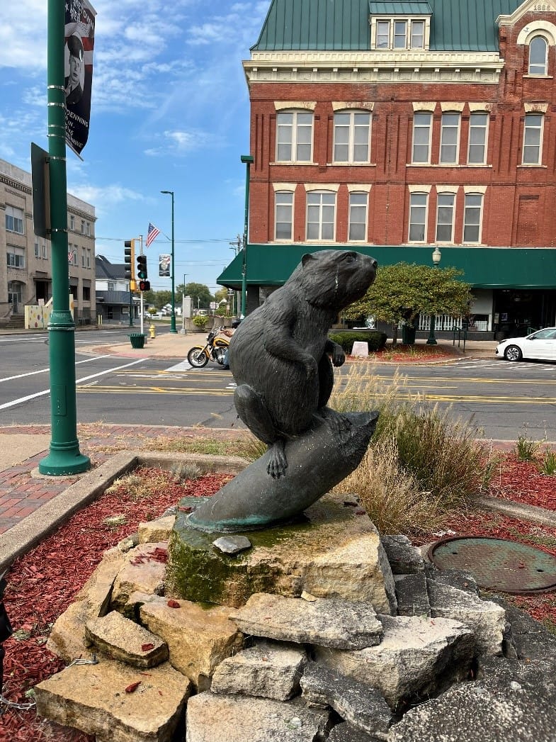 I'll wrap this post up with one more piece of beaver art. One of the places I was travelling for my job this summer was Clinton, Iowa. The downtown there wasn't much (although it did have a couple of good large antique stores), but it had some nice sculptures of Mississippi wildlife, including this one of a beaver:
