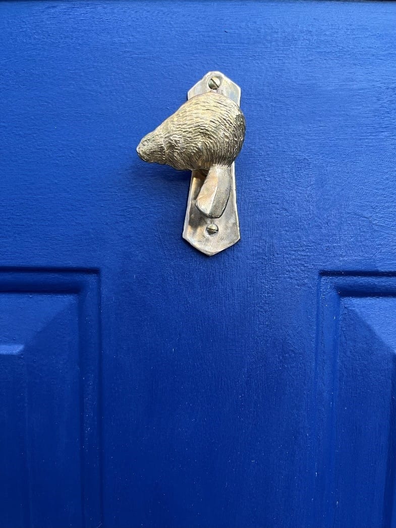 This summer we got the outside of our house refreshed with a new paint job, including the doors. To complete the look I wanted and to add a unique touch, I had the idea to install a door-knocker. The traditional animal for such things is the lion, but I thought that an animal that I feel some affinity for would give it more of a personal flavour; plus, beavers use their tails to make an audible alert, which seemed very fitting for a door-knocker.