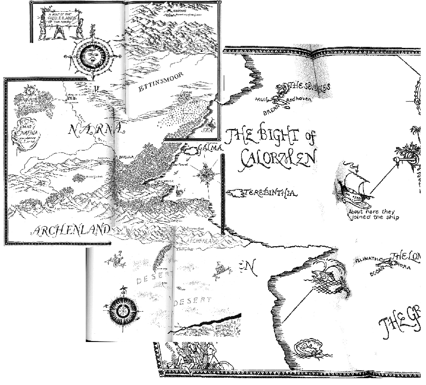 There they could see the whole valley of Narnia stretched out to where, just before the eastern horizon, there was a gleam of the sea. And now they were so high that they could see tiny-looking jagged mountains appearing beyond the northwest moors, and plains of what looked like sand far in the south.
