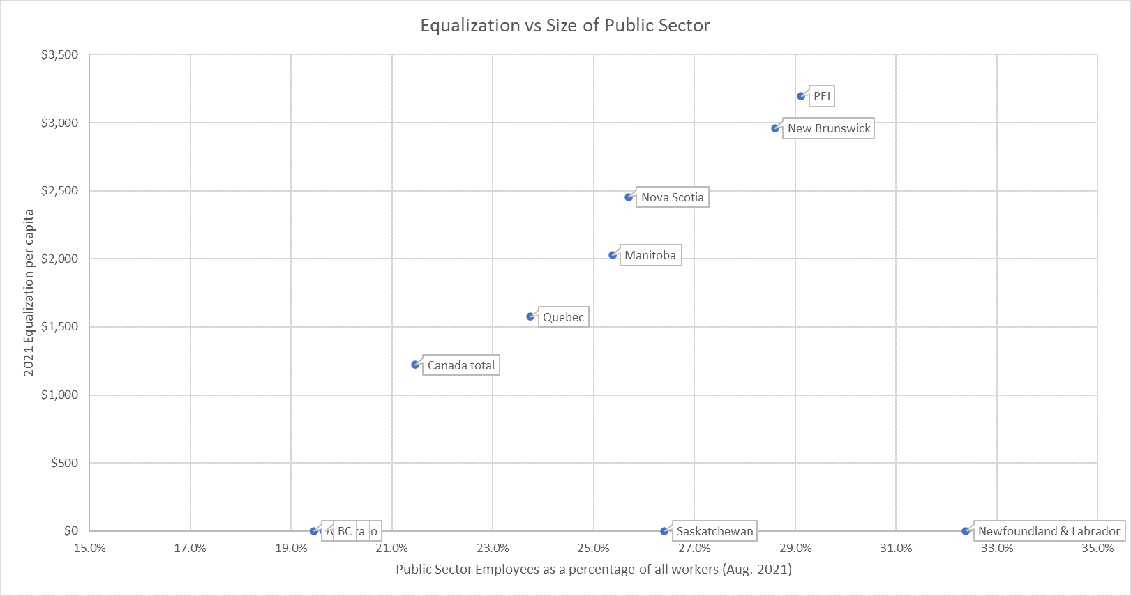The Equalization data came from here and the data on employment by sector from here. Alberta, BC, and Ontario cluster around having 19.6% of their workforce in the public sector. The "Canada total" datapoint is just the average Equalization payments per capita for all provinces; the per capita average for the whole country is $570. Note that Saskatchewan and Newfoundland & Labrador look like they don't fit the trend, but they would both get Equalization payments under the base formula (instead a "resource revenue adjustment" is applied); furthermore, Newfoundland & Labrador recently received a quasi-bailout from the Federal government (with the transfer of part of the Muskrat Falls boondoggle from the former to the latter). In NB, 101,700 people are employed in the public sector (this isn't just provincial employees but includes other levels of government as well) out of a workforce of 355,600 (including self-employed), for a composition of 28.6%. This has increased by around 17,000 compared to 10 years ago (when the composition was 23.9%; I'm using records from August of each year to be consistent; and note that there was a dip (to 22.9% in 2016) in the intervening period), while the total size of the workforce has hardly budged—so the private sector has actually shrunk (or at least has been slower to recover from the pandemic). It's hard to look at the data and say that the public sector has been getting the short end of the stick here.