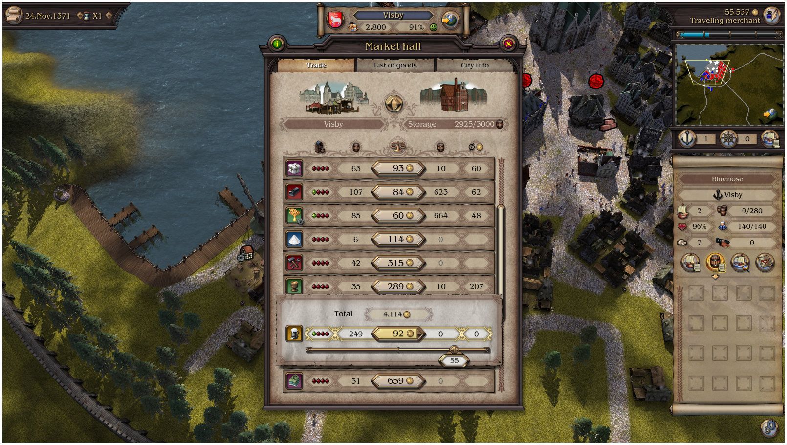 Patrician IV is a game set in the historic Hanseatic League, a late medieval trading network centered in northern Germany and extending throughout the Baltic and a fair bit of the North Sea. The game features well over a dozen goods that can be bought and sold in towns across the region. Their prices vary depending on their availability in each market and when the player buys or sells a quantity of goods, the average unit price is rarely the same as the spot price before the transaction, since the availability is dynamically altered during the transaction, reflecting market depth. Next to each good in the market there are up to four diamonds, reflecting its abundance/availability. Buying up something that is already scarce or in high demand (1 diamond or less) will lower your popularity in that town, but selling something scarce will increase your popularity (and earn a nice profit in the process). This video explains more about the trading system in Patrician IV.