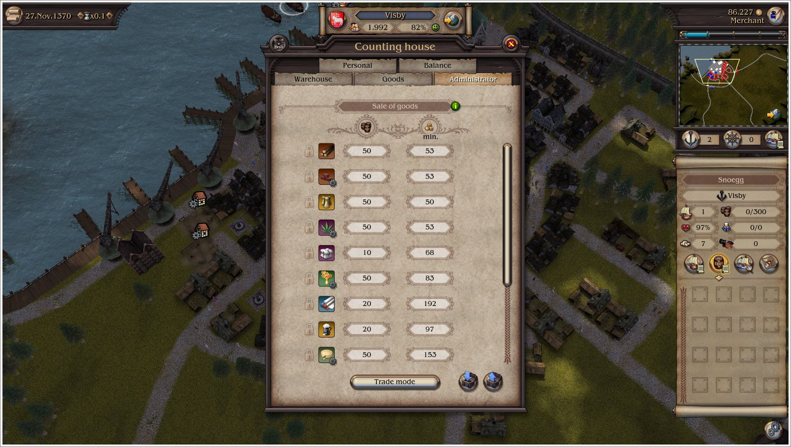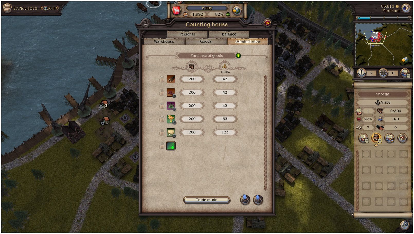 The game begins in April of 1370. By the end of that year, my initial trade runs (in which I manually told my ship where to go and what to buy and sell) had brought in enough income that I was able to expand my business to 3 ships and several properties in my hometown: a warehouse, a few houses (rental income), and two hemp farms. With storage space in my warehouse and an administrator on staff in my counting house, I no longer had to manually trade in Visby. Instead, I could set rules to buy or sell up to a certain quantity of various goods whenever the price went past a given point. The next two screenshots show these rules. For example, I'll sell cheese from my warehouse (maintaining a reserve of 50 units for loading on ships to trade to other ports) when the price rises above 155 and buy cheese (up to 200 units) when the price falls below 123. The goods to buy are only those that are produced in Visby, while the goods to sell includes most of the commodities available in the game. I set these rules by looking at the normally prevailing prices in the local market (i.e. with locally-produced goods abundantly available and imported goods in high demand due to scarcity). This way, when my ships returned from trading voyages, I could unload the goods to my own warehouse and sell them when the market conditions were favourable, instead of being at the mercy of whatever the market price was at the conclusion of a voyage. Prices change when other merchants make large purchases or sales (among other factors), so having a higher sell price for the same goods I have rules to buy allows for taking some quick profit—with no added work or risk—on occasions when someone else drives the price up.