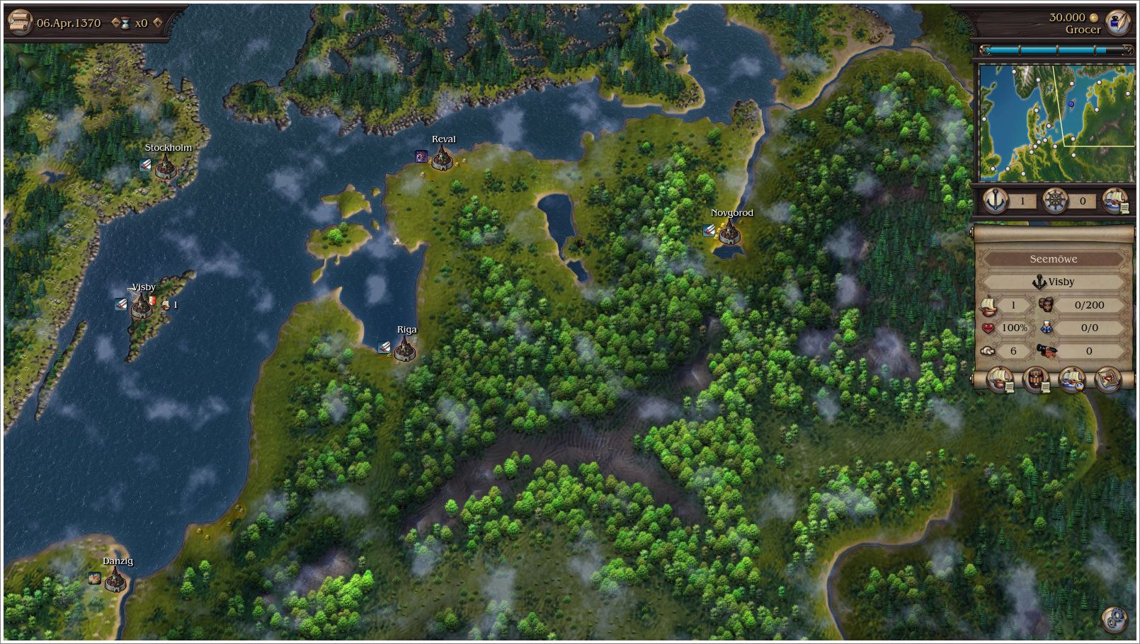 By the end of April in 1372, I'd reached the rank of Grand Merchant. And had finally defeated a pirate fleet for the first time. That was about as far as I played on this play-through. My next expansion plans were to expand to Novgorod and then Copenhagen. The former would allow me to collect pelts in a warehouse or even produce them in my own businesses, so I could get a favourable price for a key trade good my convoys were bringing from the east. The latter would serve as a western hub the way Visby had on the eastern half of the map. Eventually, I'd aim to implement a hub-and-spokes trading network of automated convoys in the west, with other automated convoys circulating goods produced in my own businesses between the ports where I had a presence. Beyond that, an established merchant can get married and start a family, and even run for office. My Patrician IV strategy always includes keeping one fleet that I control manually so I can perform missions, take advantage of abnormal supply/demand conditions (in-game events sometimes result in a supply glut or demand spike of a trade good in a town somewhere), and fight pirates. There's also a sketchy guy in some taverns that tries to persuade you to partner with him in plausibly-deniable acts of piracy, but I try to resist that temptation.
