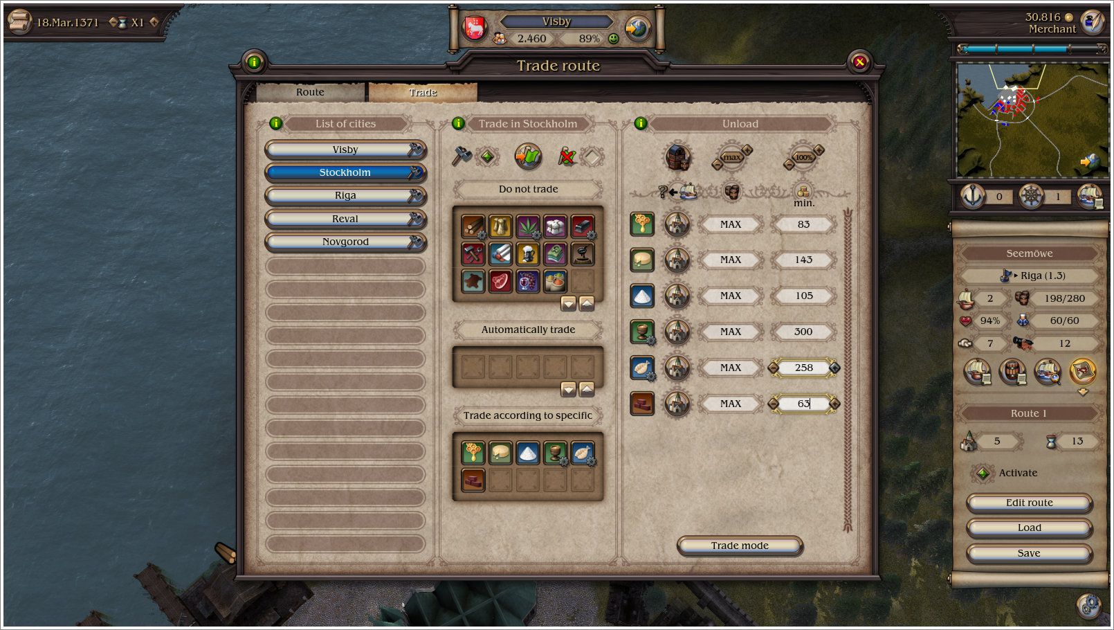 By the spring of 1371, I was ready to automate one of my regular trade routes. Similar to the settings shown above for a counting house in my home port, the game allows you to set rules for prices and quantities of goods to load or unload at a sequence of ports. I set up a circuit from Visby - Stockholm - Riga - Reval - Novgorod and then repeating. It traded the same goods I had already been dealing with on the voyages I controlled directly (e.g. cheese and honey from Visby, mead and fish from Stockholm, salt and pelts from Novgorod). The screenshot below shows the sell settings for Stockholm. Note that even though I'm buying fish and mead there, I also have rules to sell them at a much higher price should the opportunity arise.
