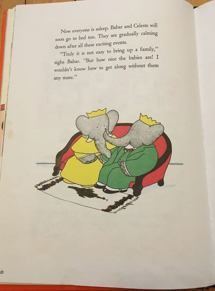 Babar and his wife have kids, and then everyone is kept busy rescuing them from danger. The vocabulary is not dumbed down, and in places the sentence construction bears traces of the French it was translated from. We also have a Babar book by de Brunhoff's son that sees the elephant royal family travel around the world and learn a little bit about different languages and cultures.