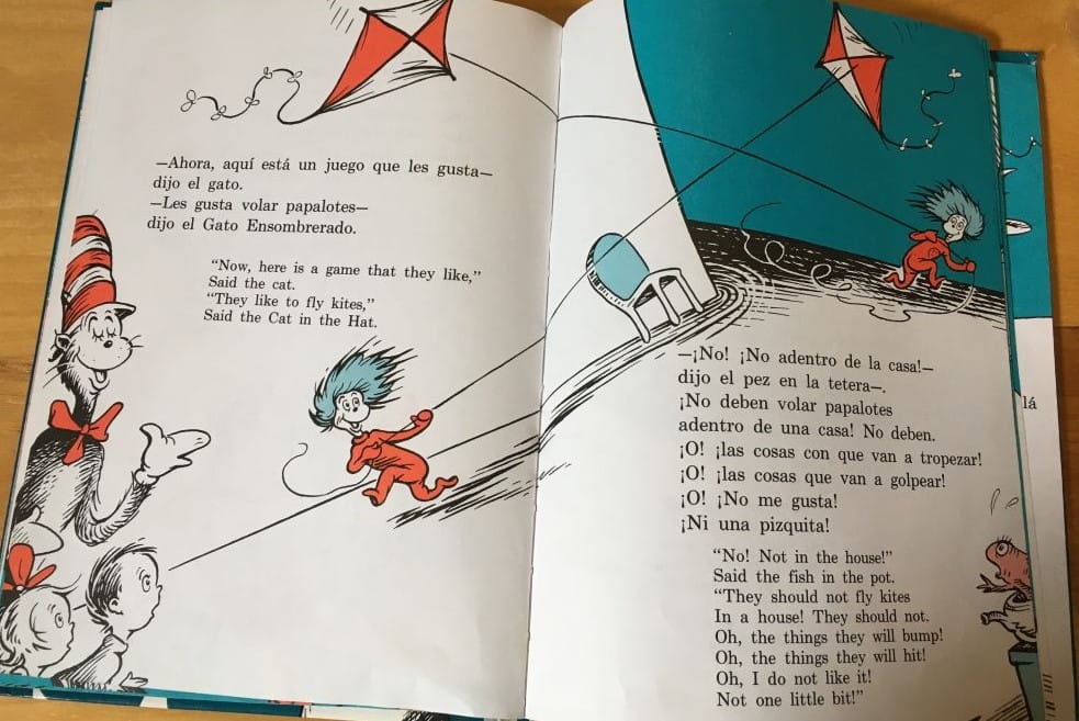 I find Dr. Seuss fun to read aloud because of his playful mastery of language. Some people find his made-up nonsense words annoying, but there are definitely books of his such as this one that keep them to a minimum (Oh, the Places You'll Go is another one we have that's pretty good on that score). Somehow we ended up with a version that includes a Spanish translation on each page. The translation is pretty literal and doesn't preserve the poetry—but still occasionally lands phrases that roll off the tongue nicely like "dijo el pez en la tetera". It is also fun to ponder as an adult whether it's written with an unreliable narrator and e.g. Thing 1 and Thing 2 are simply the unrestrained id of each child.
