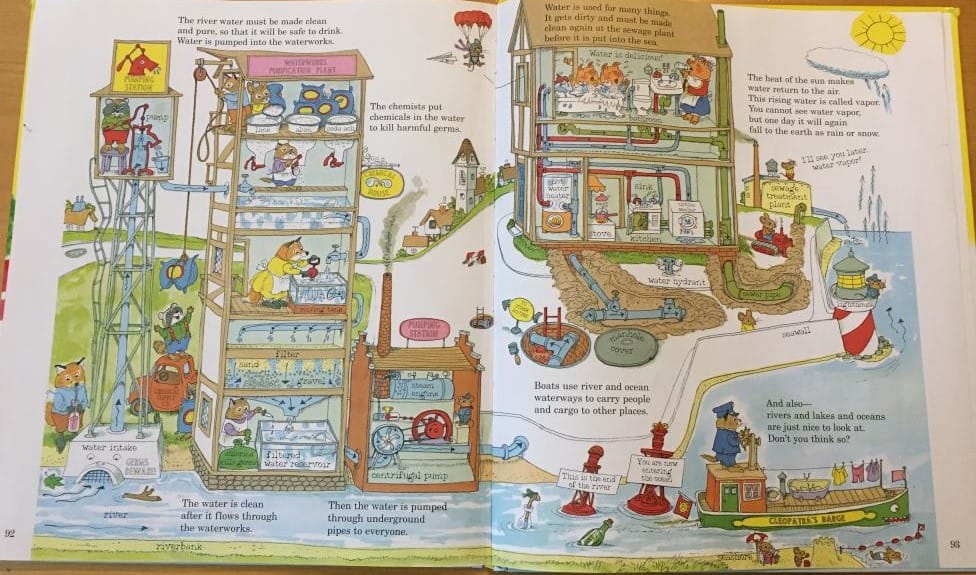 This book is a great introduction to the idea of jobs and money. The selection of jobs is very mid-century (and some of the technologies shown would have been obsolete even then, such as steam-powered construction equipment) but has good coverage of the breadth of the economy, from primary sectors, to manufacturing, to services. The drawings make me think of The Way Things Work by David Macaulay (a book I loved as a child, have gotten for a nephew, and plan to get for my own kids when they're the right age), adapted for the younger set. The page shown here is about water treatment, a topic I'm very familiar with, and I appreciate that while it is simplified, it's not wrong.
