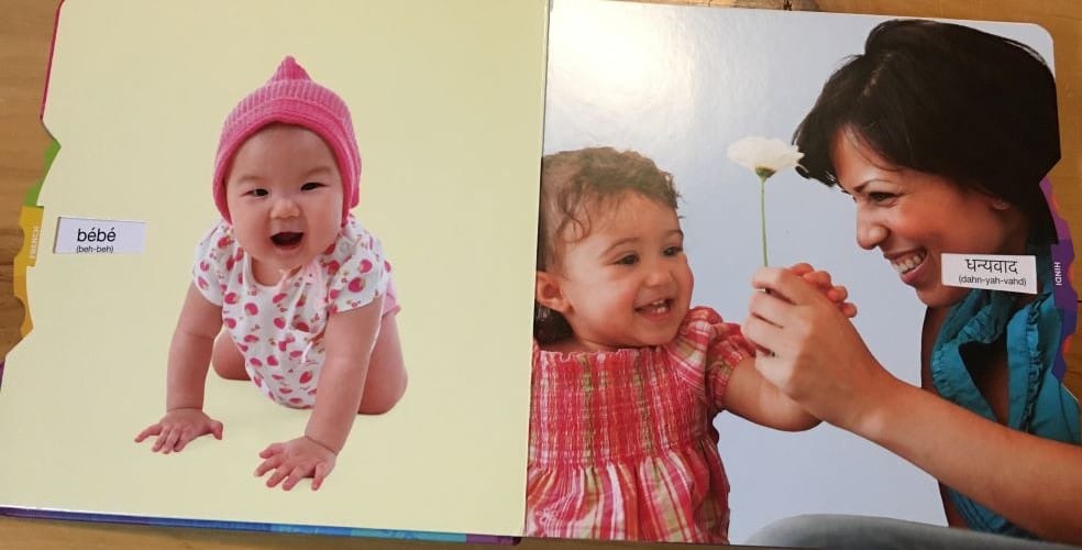 - This book is pretty cool. It has 20 words in 20 languages (which I think is also the title, or something close to that). There is a wheel that lets you select the language for each page. My younger daughter really likes looking at all the pictures (mainly photos of babies and small children whatever each word is).