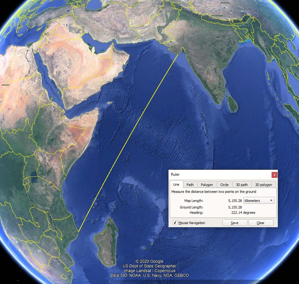 Moving on from the historical and geographical background, I'll spend a little time on ships and sailing on the monsoon seas. According to Machado, voyages from Mozambique to India (he says 3-5 ships per year plied this route out of Diu and Daman in the second half of the 1700s) lasted about a month at the start of the 19th century. Using the distance from this screenshot from Google Maps, that works out to an average speed of around 7 km/h (3.8 knots since 1 NM = 1.85 km).