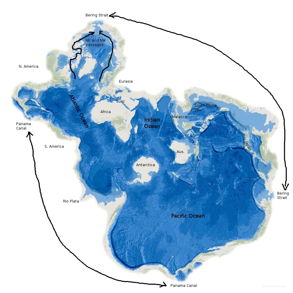 One of the themes of Sea Power is the way in which the world's oceans are connected but also separate. I saw the following map on Twitter and added a few labels to illustrate this: