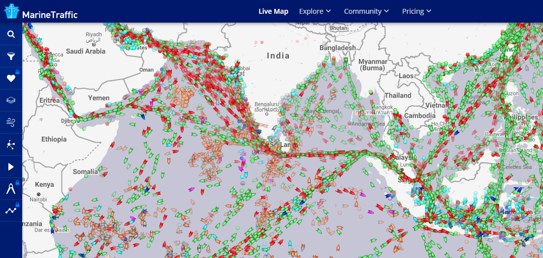 Here is a timelapse video of a container ship crossing through these waters from the Red Sea to Hong Kong. Note how crowded things get around Singapore and Hong Kong: