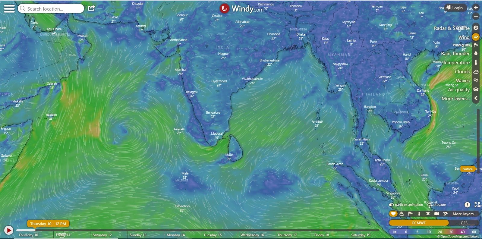 The following screenshot (source) shows the winds of the winter monsoon (roughly from the northeast) on December 9, 2020: