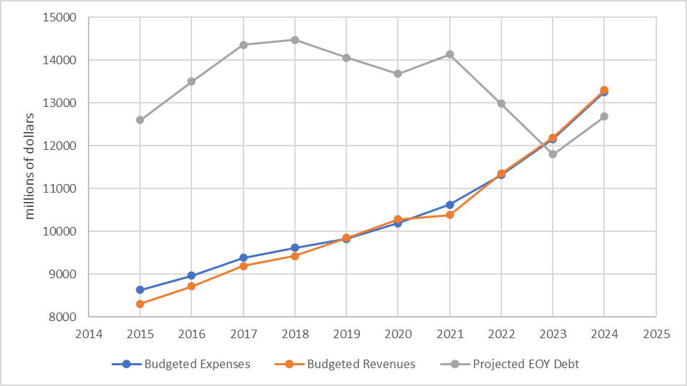 - $12600M in 2015 would be $15955M in 2024 after adjusting for inflation; the current debt forecasted for the end of the fiscal year ahead is $3277M less than that