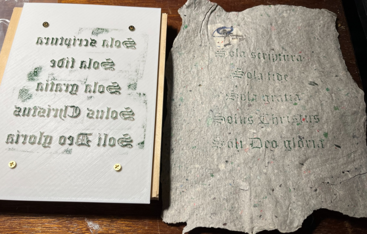 This was inspired by the influence of the printing press (moveable type was key, and this has fixed type, but whatever) on the Protestant Reformation. Attach it to a backing, ink it, and you can stamp the five "sola" statements of the Reformation.