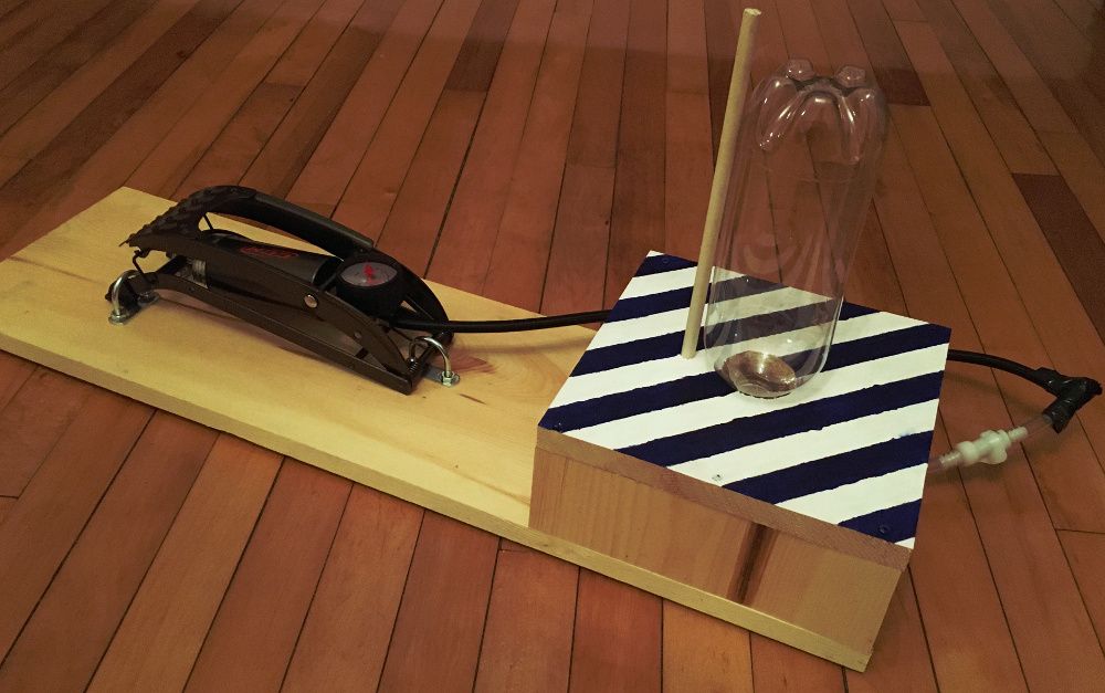 Here's a look at the launcher and its components. It comprises a support board, a platform with a circular hole to support the bottle, an air pump (intended for bike tires), and some tubing and fittings to connect the pump to the bottle.