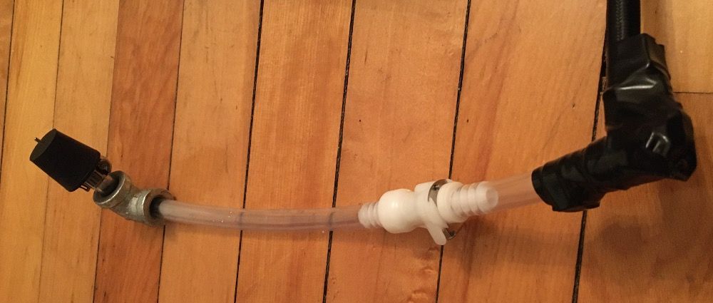 Here's a close-up of the tubing and fittings. There is a rubber stopper (53/64" to 63/64" I.D.) that fits into the mouth of a pop bottle; an inflation needle was pushed through it to allow air to get into the bottle. 5/16" tubing connects the needle to the air pump via a quick-connect fitting (so that the water in the bottle won't leak out while the air pump is being hooked up).