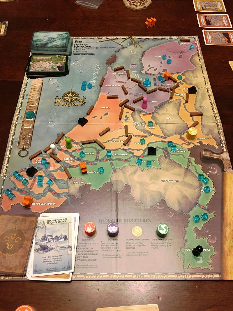 Pandemic: Rising Tide has the theme of controlling flooding in the Netherlands, and the cooperative mechanics that the Pandemic series is known for: players compete against the game, which stochastically escalates in difficulty; either it spirals out of control and you lose, or you win together before that happens. Players need to balance urgent goals of repairing dikes and draining floodwaters with longer-term goals of building protective infrastructure.
