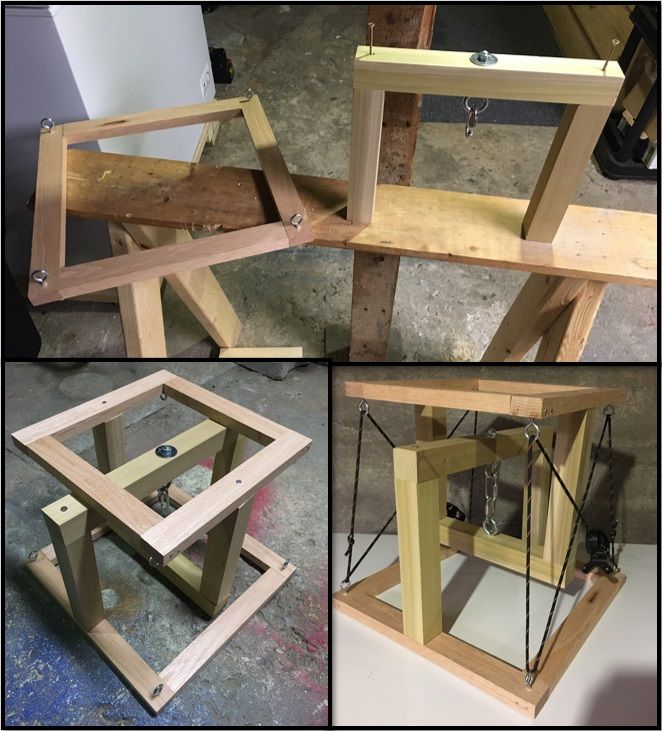 The two frames use oak 1x2s for the flat part and poplar 2x2s for the columns and lintels; the flat part is sized to be a 1-ft square—on the inside dimensions for the base and the outside dimensions for the top. The column and lintel assemblies for the two frames had to be completed with the top and bottom stacked together (see photo below on the lower left) since they need to encompass each other. Eye hooks were installed at the corners of the flat part of each frame along with eye bolts in the centre of each lintel. The final step in the structural construction (adding the plexiglass top surface came later as a finishing step) was to add the elements under tension: the chain links at the heart of the footstool and the cords connecting corresponding corners on the top and bottom frames. The cords pass through tensioning ratchets (the kind intended for clotheslines) so they can be kept taut enough to provide stability. The following photos show various stages of the construction as it progressed: