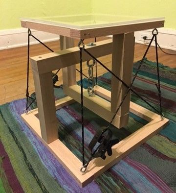 The design I came up with was for a footstool (which could also be used as a small table for beverages in front of a couch). It comprises two wooden frames held together with a couple of chain links and some cord. There is a clear sheet of plexiglass for the top surface to make the structure as visible as possible. Here is a photo, which shows the way the upper frame appears to float:
