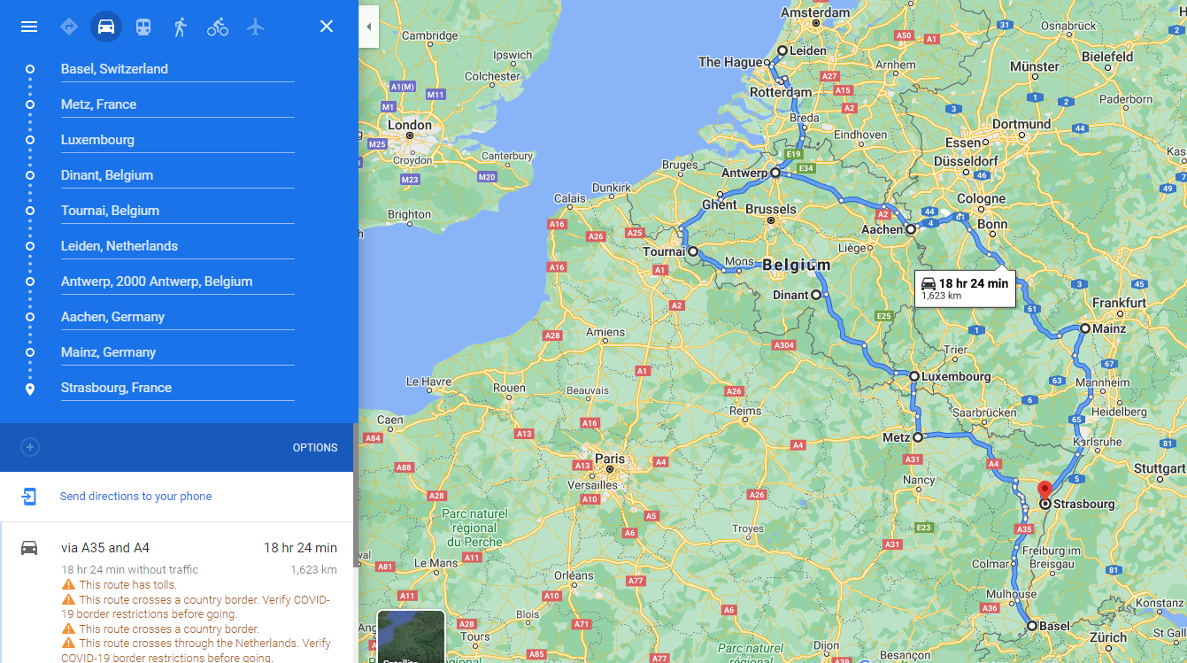 I took the best solution my program came up with and mapped it out in Google Maps (it wouldn't allow for a closed route). This is a similar distance to the tour of the Maritimes I suggested here, by the way.
