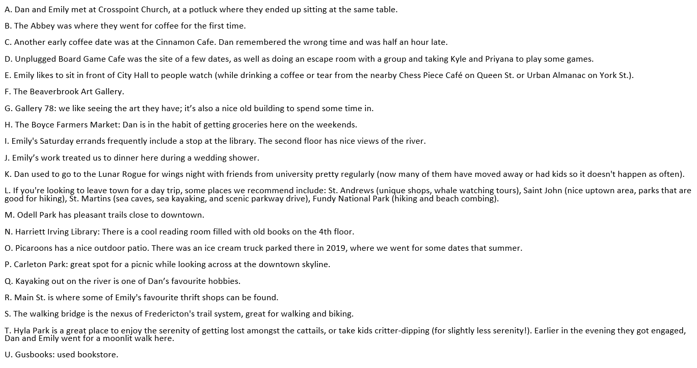 If you're looking for things to do in Fredericton before/after the wedding—or even just a good spot to grab coffee (of which there are many)—here are some suggestions from us. This map also includes places that are significant to the two of us.